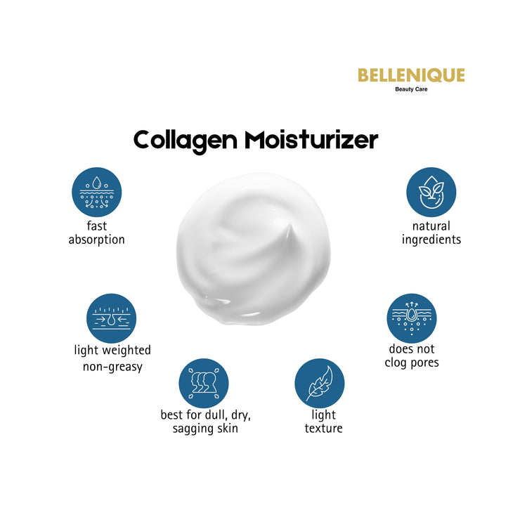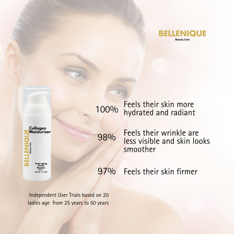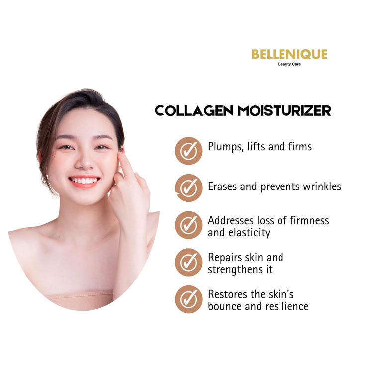 Bellenique Collagen Moisturizer works to give you younger looking, radiant skin. Containing a high concentration of elastin and collagen, it has a gel like texture which instantly absorbs to reduce the appearance of wrinkles and improve the feel of the complexion.