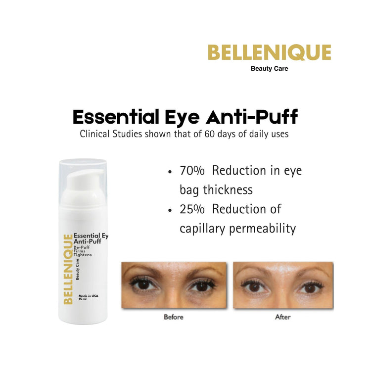 Bellenique Essential Anti-Puff de-puffs and tightens, this lightweight cooling gel is easily used with other moisturizers or sun protection formulas. This is a blend of Essential Oils that decongest puffy eyes. Clinical results have shown that 65% of subjects had a decrease in eye bag thickness after 28 days. Testing also indicated a 25% reduction of capillary permeability.